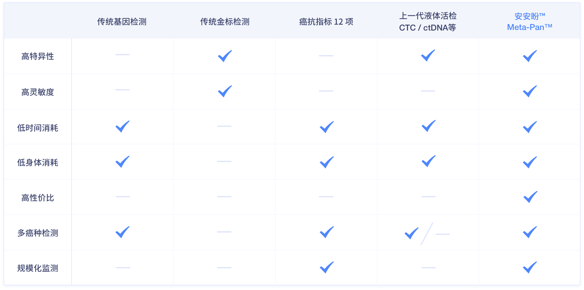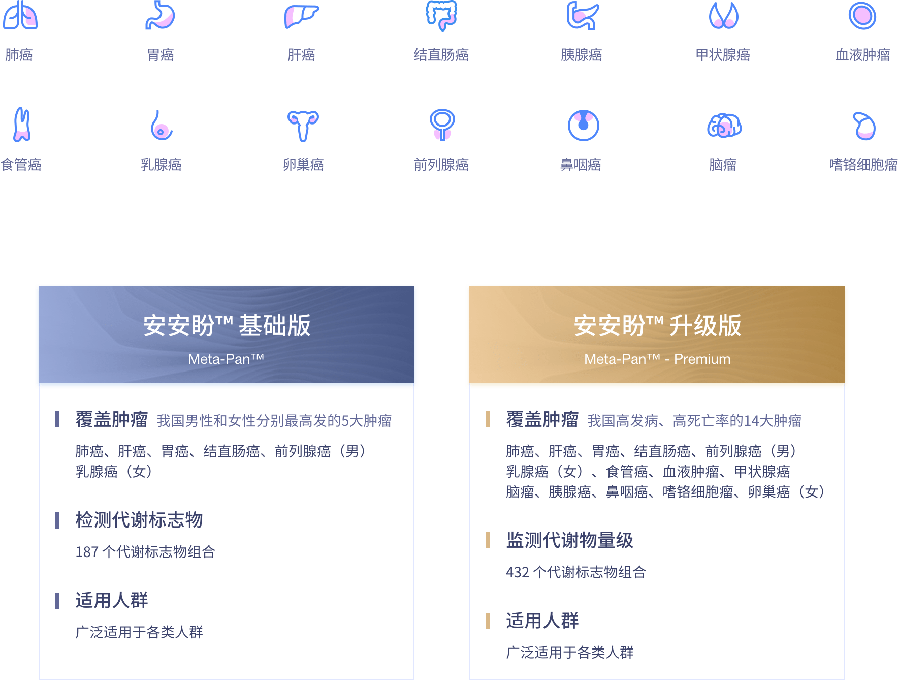 安安盼™(Meta-Pan™)是基于代谢组学技术,结合大量翔实临床数据,并利用生物多组学前沿研究、机器学习和大数据技术进行分析研究的肿瘤早筛检测产品,可由用户自主选择所囊括的肿瘤检测套餐。